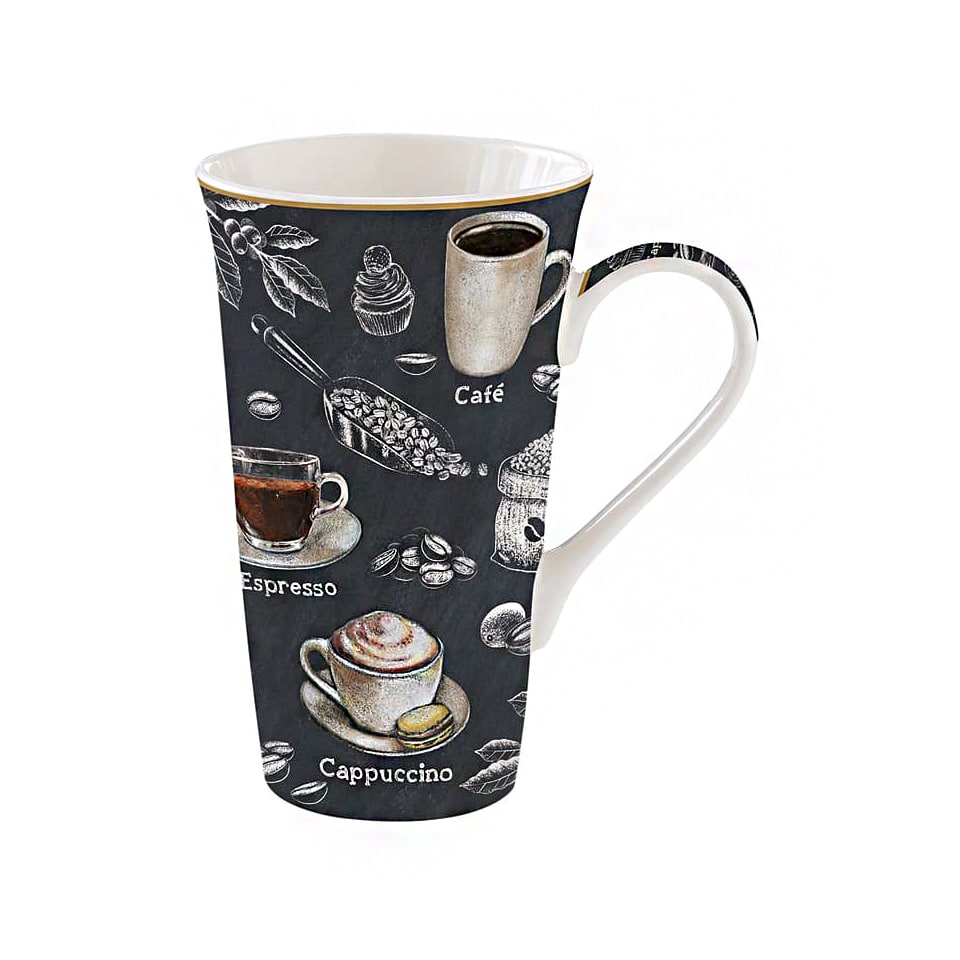 A Barista extra nagy kávésbögre a klasszikus füstös fekete alapon krétarajz stílusú kávéillusztrációkkal díszített retro design és a modern kávézók hangulatának az ötvözete. Espresso, cappuccino, café latte – mindegyik megtalálható rajta, így akár inspirációként is szolgálhat a reggeli kávédhoz. Az extra űrtartalom pedig bőséges adag kávéhoz, teához vagy forró csokihoz is tökéletes. Az extra nagy űrtartalmat a feltűnően magas kialakításával érték el, miközben megőrizték kényelmes fogású, klasszikus formavilágát is a kávésbögrének.